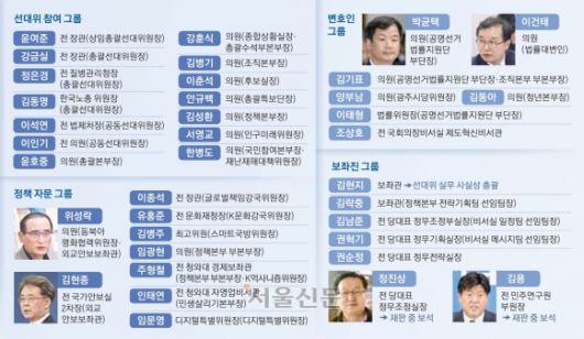 이 당선인 관련 사건의 변호를 맡으며 인연을 맺은 변호인 그룹도 임기 초반 사법 이슈 대응에 있어 영향력이 더욱 커질 수 있다. 고검장을 지낸 박균택 의원은 경선 캠프 법률지원단장과 본선 선대위 공명선거법률지원단 부단장을 맡아 각종 네거티브 공세에 대응했다. 이건태·김기표·김동아·양부남 의원 등과 함께 ‘대장동 변호사’ 5인방으로도 통한다. 이태형 법률위원장과 조상호 전 국회의장실 제도개혁비서관도 대통령실 합류가 유력한 것으로 평가받는다.