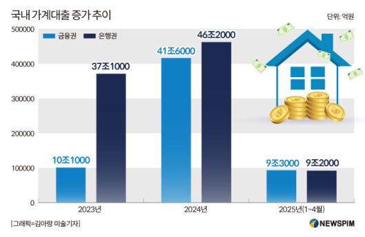 올해 1월 9000억원이 감소하며 안정세에 접어는 듯 했던 가계대출은, 2월에 4조2000억원으로 늘었다가 3월에는 7000억원으로 증가세가 대폭 둔화됐다. 하지만 4월에 토허제 번복 사태 영향과 증시 변동성에 따른 투자성 대출 등이 몰리며 5조3000억원으로 다시 급증했다.