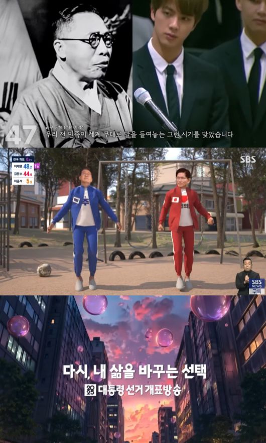 SBS의 개표 방송은 전 세계적인 흥행을 기록한 넷플릭스 '오징어 게임' 콘셉트를 패러디했다. 이재명 더불어민주당 후보와 김문수 국민의힘 후보가 '오징어 게임' 각각 당색인 파란색과 빨간색 체육복을 입고 등장해 다양한 게임을 진행하는 CG로 치열한 접전을 그려냈다.