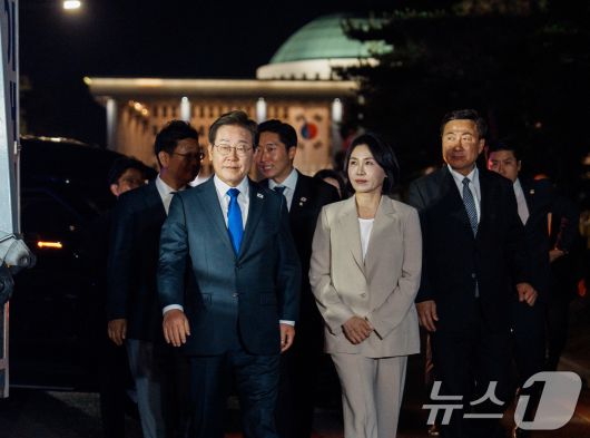 당선이 확실시된 이재명 더불어민주당 대통령 후보와 부인 김혜경 여사가 4일 서울 여의도 국회 앞에 마련된 민주당 국민개표방송시청 현장에 도착하고 있다. (공동취재) 2025.6.4/뉴스1 ⓒ News1 안은나 기자 |