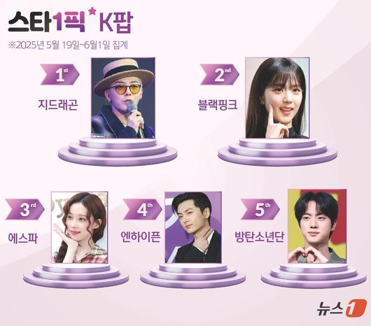 가수 지드래곤은 이번 [스타1픽]에서 K팝 아이돌 부문 1위를 탈환했다. 지난해 가요계에 화려하게 컴백한 지드래곤은 '파워', '홈 스위트 홈', '투 배드' 등의 곡을 발표하며 활발한 활동을 이어가고 있다. 지난달 인천국제공항에서 포착된 지드래곤은 데님 모자에 체크무늬 아우터, 흰색 상의를 매치해 패셔니스타다운 독보적 스타일을 자랑해 눈길을 사로잡았다. 현재 지드래곤은 솔로 월드투어 '위버맨쉬'를 전개함과 동시에 해외 무대에도 오르고 있다. 지난 5월 31일(현지 시각) 미국 캘리포니아 패서디나 로즈볼의 브룩사이드에서 열린 음악 축제 'HITC LA 2025'에 헤드라이너로 출격한 지드래곤은 엔딩 무대를 장식, 여전한 기량을 뽐냈다.