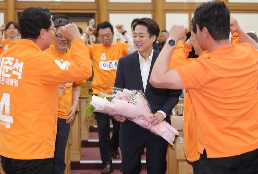 이준석 개혁신당 후보가 지난 3일 방송 3사 출구조사 발표를 확인한 뒤 국회에 마련된 당 개표상황실에 도착해 응원을 받고 있다. [연합] |