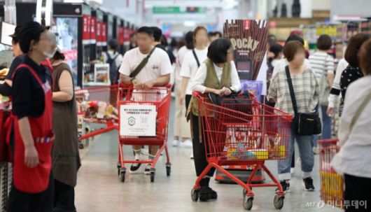 [서울=뉴시스] 김선웅 기자 = 올해 1분기 가구 실질소비지출이 코로나19 이후 가장 큰 폭으로 줄었다. 통계청이 발표한 2025년 1분기 가계동향에 따르면 올해 1분기 가구당 월평균 소비지출은 1년 전보다 1.4% 증가한 295만원으로 물가 수준을 고려한 실질소비지출은 0.7% 감소했다. 이는 2023년 2분기 이후 첫 감소 전환이며 코로나19 유행때인 2020년 4분기(-2.8%) 이후 가장 큰 폭으로 감소한 수치다. 29일 서울 소재 유통매장에서 시민들이 장을 보고 있다. 2025.05.29. |