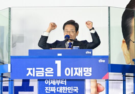 이재명 제21대 대통령 당선인이 4일 서울 여의도 국회 인근에서 당 주최로 열린 국민개표방송 행사에 참석해 연설하고 있다./공동취재단 |