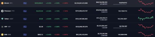 4일 글로벌 가상자산 시황중계 사이트 코인마켓캡에 따르면 이날 오전 7시 54분 기준 비트코인 가격은 24시간 전 대비 0.18% 오른 10만 5909달러에 거래됐다. 일주일 전과 비교하면 2.8% 하락했다. 알트코인(비트코인 외 가상자산)의 대표격인 이더리움은 전일 대비 1.1% 오른 2610달러를 기록했다.