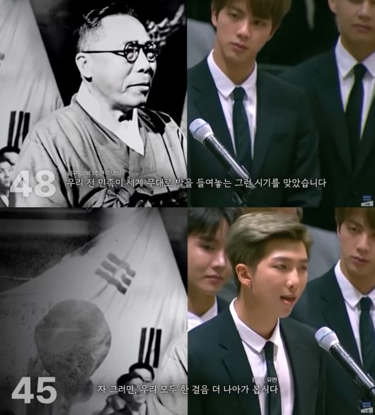 특히 영상 중반부에서는 김구 선생이 1946년 광복절 기념식 연설에서 말한 "우리 전 민족이 세계 무대로 발을 들여놓는 그런 시기를 맞았습니다"라는 대사와 그룹 방탄소년단(BTS) 리더 RM이 유엔(UN) 연설에서 말한 "그러면 우리 모두 한 걸음 더 나아가 봅시다"라는 대사가 연결돼 눈길을 끌었다. 두 영상은 절묘하게 교차되면서 과거 독립운동가와 현재 글로벌 무대에서 활약하는 K팝 아티스트의 목소리를 연결해 '함께'의 가치를 강조했다는 호평을 받았다.