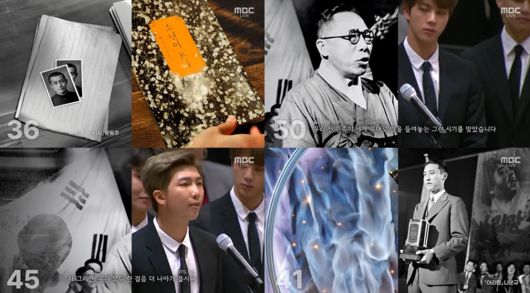 또한 김구 선생이 1946년 광복 1주년 기념식에서 "우리 전 민족이 세계 무대로 발을 들여놓는 그런 시기를 맞았다"며 연설하는 장면에서는 방탄소년단(BTS)이 등장했다. 리더 RM이 지난 2018년 UN 연설 당시 "자 그러면 우리 모두 한 걸음 더 나아가봅시다"라고 했던 장면으로 이어져 눈길을 끌었다.