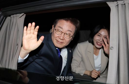 이재명 대통령과 김혜경 여사가 4일 서울 여의도 국회앞에서 국민개표방송을 마치고 차에서 손을 흔들고 있다. 박민규 선임기자 |