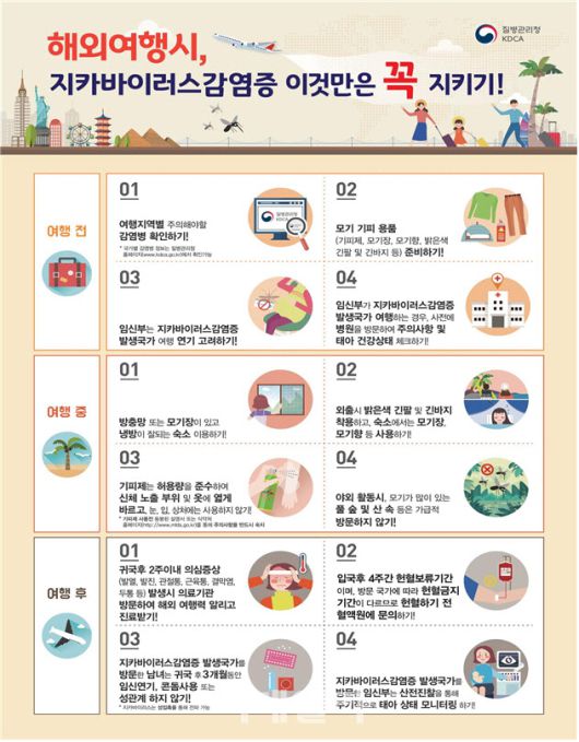질병청은 지카바이러스 감염증 발생국가 여행 후 3개월간 임신 연기 및 콘돔 사용 등 성 접촉을 피하고, 예방수칙을 숙지해야 한다고 강조했다. 태아의 선천성 기형을 초래할 수 있어서다. 이를 위해 해외 출국 전에는 △해당 지역별 주의해야 할 감염병 정보 확인하기(질병청 누리집 국가별감염병예방정보) △모기 예방법을 숙지하고 모기기피 용품 및 상비약 준비하기 등을 점검해야 한다.