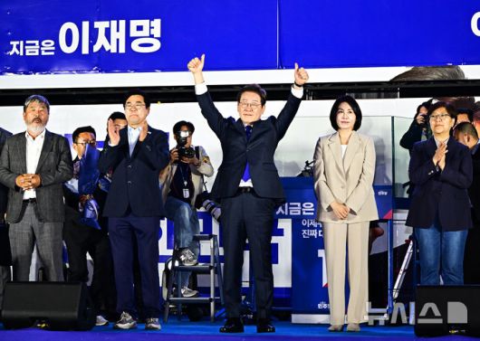 [서울=뉴시스] 조성우 기자 = 이재명 대통령이 4일 오전 서울 여의도 국회 앞에서 열린 국민 개표방송 행사에서 시민들에게 인사하고 있다. (공동취재) 2025.06.04. photo@newsis.com |
