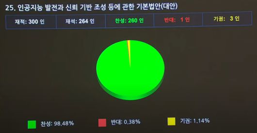 정치권 안팎에서는 AI기본법 규제 유예 가능성도 거론된다. 지난해 12월 국회 본회의를 통과해 내년 1월22일부터 발효되는 AI 기본법은 사업자에게 ▲고영향 AI나 생성형 AI 사용 사실에 대한 사전고지 의무 ▲AI 관련 안전사고 모니터링 및 위험관리체계 구축 ▲고영향 AI 영향평가 실시 등 책임과 의무를 부과하고 있다.