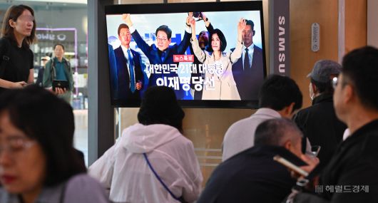 4일 오전 서울 용산구 서울역 대합실에서 시민들이 이재명 대통령 당선 관련 뉴스를 시청하고 있다. 임세준 기자 |