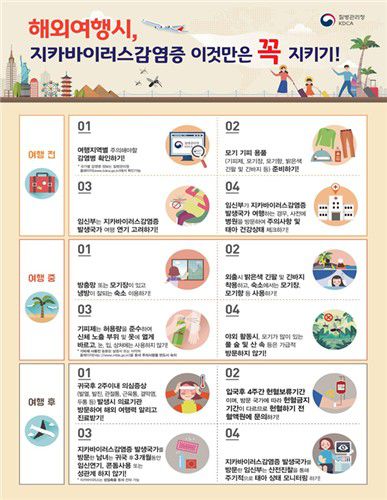 질병청은 지카바이러스에 대한 백신이나 치료제가 없어 모기에 물리지 않는 것이 가장 중요하다며 감염증 발생국가 여행 시 예방수칙을 준수해 달라고 강조했다.