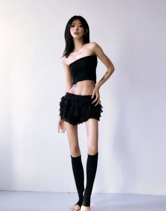 복부 라인은 뼈마저 도드라질 정도로 얇고 선명하며, 드러난 팔과 다리도 체지방이 거의 느껴지지 않을 만큼 날렵한 실루엣을 자랑했다. 특히 앙상하리만치 마른 체형과 자신감 있는 포즈가 시선을 사로잡는다.