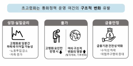 바뀐 여건에서 통화정책의 실효성을 제고하기 위한 노력도 병행돼야 한다고 봤다. 황 실장은 "고령화에 따른 정책 여건 변화에 맞춰 공개시장 운영 환경을 지속해서 정비하고, 정책 커뮤니케이션을 정교화해 시장 기대를 효과적으로 관리해야 한다"고 짚었다. 이어 "통화정책과 거시건전성 정책의 적절한 공조를 통해 정책의 실효성을 높여가야 한다"고 강조했다.