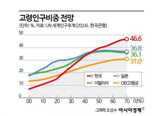 물가는 소폭 내릴 것으로 전망됐다. 황 실장은 "고령화는 2025~2070년 중 우리나라 물가상승률에 연평균 0.15%포인트의 하방 압력을 가할 것으로 분석됐다"며 "다만 탈세계화, 공급망 재편, 기후변화 등 물가에 상방 압력을 가하는 구조적 요인들도 있어, 장기적으로 물가 방향성은 불확실성이 크다"고 짚었다.