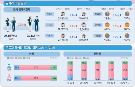[세종=뉴스핌] 김기랑 기자 = 지난 2023년 국내 일자리 시장에서 이동자와 진입자가 모두 줄어든 것으로 나타났다. 이는 경기 둔화와 고용시장 불확실성 심화에 따른 영향으로 풀이된다.