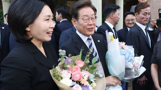▲ 이재명 대통령과 김혜경 여사가 4일 인천 계양구 사저를 나서며 주민, 지지자로부터 꽃다발을 받고 있다.