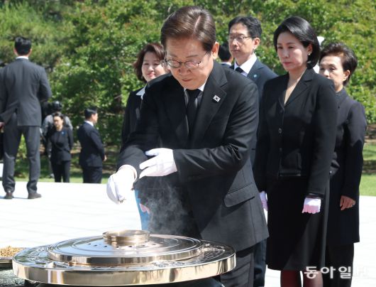 이재명 대통령이 4일 서울 동작구 국립서울현충원에서 현충탑을 참배하며 분향하고 있다. 대통령실사진기자단 송은석 기자 silverstone@donga.com |