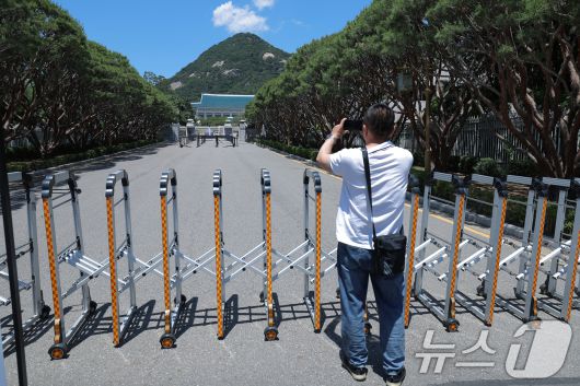 (서울=뉴스1) 박정호 기자 = 권력의 상징에서 ‘국민 품으로 돌아간 공간’으로 환영받았던 청와대가 다시 대통령 집무실로 변경될 예정인 가운데 4일 휴관으로 문이 닫힌 청와대를 찾은 외국인 관광객이 기념 사진을 찍고 있다. 이재명 대통령은 후보 시절 “대통령실을 용산에서 시작하되, 이후 보수 공사를 거쳐 청와대로 이전하겠다”는 입장을 밝힌 바 있다. 2025.6.4/뉴스1