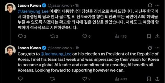 제이슨 권 오픈AI 최고전략책임자(CSO)는 이날 엑스(X·옛 트위터)에 축하 글을 올리고 새 정부의 AI 정책에 대한 지원 방침을 밝혔습니다.