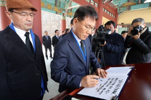 더불어민주당 국방안보특별위원회 황인권 위원장이 3월6일 광주 북구 국립5·18민주묘지에서 방명록을 작성하고 있다.(사진=연합뉴스) |