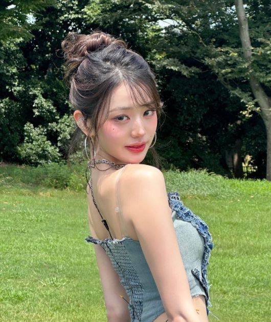 아이브 멤버 장원영이 야외 녹지에서 청록색 의상을 입고 카메라를 향해 포즈를 취하고 있다. |