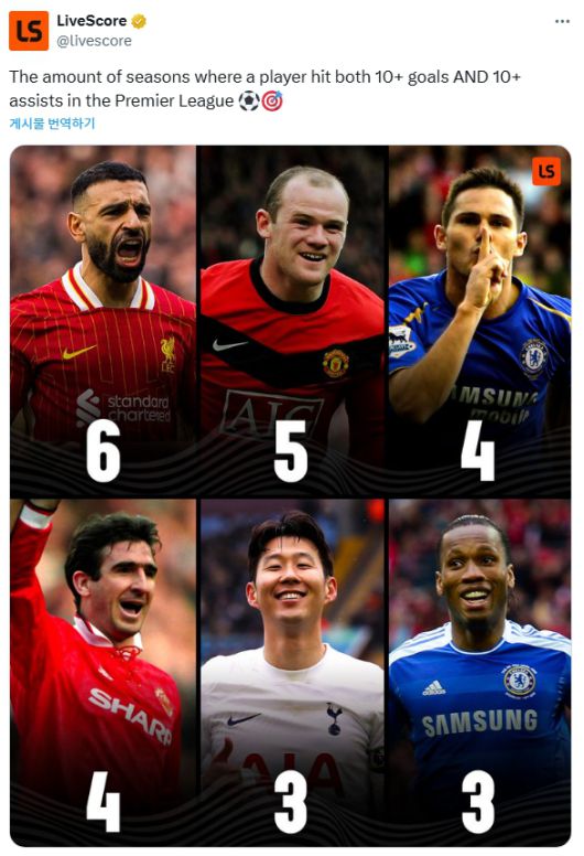 첼시 레전드 프랭크 램파드와 '올드 트래포드의 왕' 에릭 칸토나가 나란히 4회로 공동 3위에 올랐고 손흥민과 디디에 드록바가 3회로 바투 좇았다.