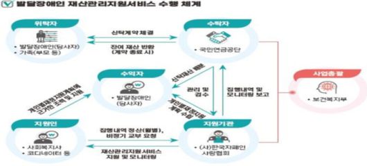 복지부는 재산 관리 지원서비스 제공 업무를 국민연금공단에 위탁한다. 재산 관리 지원서비스를 이용하려는 국민은 신청서에 장애인등록증 사본을 첨부해 국민연금공단에 제출해야 한다. 서비스 신청자가 보호자인 경우는 발달장애인과의 관계를 확인할 수 있는 서류를 함께 제출해야 한다.