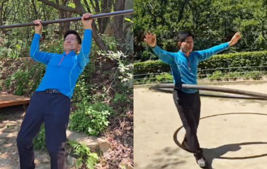 공개된 영상에는 김 전 후보가 철봉에 매달려 턱걸이를 하고 대형 훌라후프를 돌리는 모습이 담겼다.
