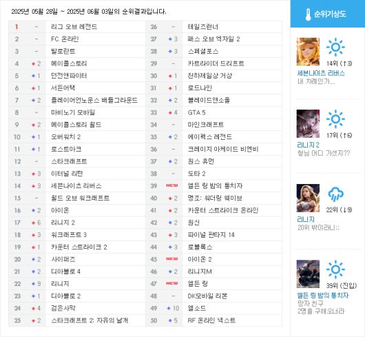 하위권에서는 지난 5월 30일에 출시된 엘든 링 밤의 통치자가 39위로 입성했다. 3인 협동을 기반으로 한 엘든 링 스핀오프 타이틀로, 로그라이크식 진행과 소울라이크 보스전을 결합한 게임성을 선보인다. 난이도는 높은 편이지만 국내에서도 엘든 링을 기점으로 소울라이크를 선호하는 유저가 크게 늘었고, 원작 인기가 상당히 높았기에 발매와 함께 인기순위에서 두각을 드러낸 것으로 분석된다. 주요 지표를 살펴보면 포털 검색량과 개인방송 시청자 수가 큰 폭으로 증가했다.