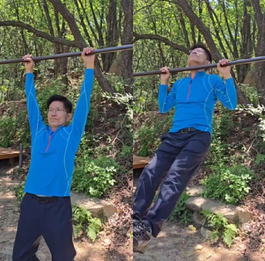 제21대 대통령 선거에서 패배한 김문수 전 국민의힘 대선 후보가 일상으로 복귀했다. 사진은 김 전 후보가 턱걸이를 하는 모습. [사진=김재원 전 국민의힘 최고위원 페이스북] |
