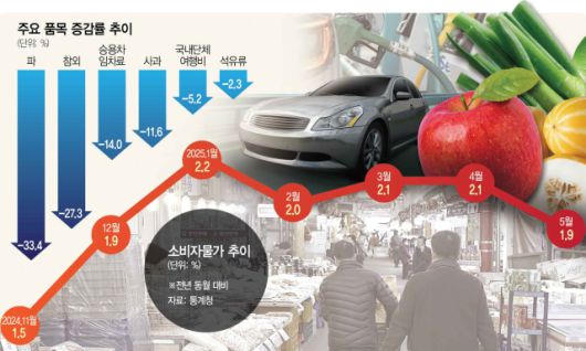 물가가 5개월 만에 1%대로 떨어진 데는 채소와 석유류 가격 하락이 주요 원인으로 작용했다. 기상 여건 개선으로 농산물 가격은 전년보다 4.7% 떨어졌고 특히 채소류가 5.4% 급락해 2022년 4월(-5.4%) 이후 3년 1개월 만에 최대 하락 폭을 기록했다. 실제 배추(-15.7%), 파(-33.4%), 사과(-11.6%), 배(-14.4%) 등 주요 농산물 가격이 줄줄이 큰 폭으로 하락했다. 작황 호조와 지난해 높은 기저효과가 맞물리며 채소 가격이 낮아졌다는 게 통계청의 설명이다.