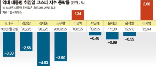 13대 노태우 대통령(취임 당일 휴장, 다음날 2월26일 기준)은 3.30%, 14대 김영삼 대통령은 2.56%, 15대 김대중 대통령은 4.53% 각각 내렸다. 이어 16대 노무현 대통령이 취임했던 지난 2023년 2월 25일에는 3.90% 하락했으며, 18대 박근혜, 19대 문재인 대통령 때도 취임 당일 각각 0.46%, 0.99% 떨어졌다. 20대 윤석열 대통령의 취임 당일인 지난 2022년 5월 10일에도 0.55% 하락하며, 징크스를 피해 가지 못했다.