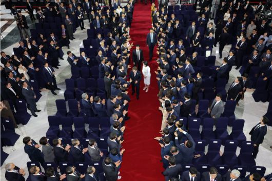 이재명 대통령과 부인 김혜경 여사가 4일 제21대 대통령 취임 선서식이 열리는 국회 로텐더홀에 입장하면서 참석자들과 인사하고 있다. 연합뉴스 |