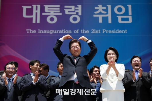 이재명 대통령 내외가 4일 오전 서울 여의도 국회 로텐더홀에서 취임 선서를 마치고 나와 잔디광장에 모인 시민들을 향해 팔로 하트를 만들어 보이고 있다. 2025.06.04 김호영기자 [ⓒ 매일경제 & mk.co.kr, 무단 전재, 재배포 및 AI학습 이용 금지]