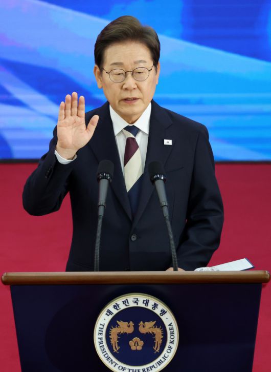 [서울=뉴스핌] 국회사진기자단 = 제21대 대통령에 당선된 이재명 대통령이 4일 국회 로텐더홀에서 취임선서를 하고 있다. 2025.06.04 photo@newspim.com |