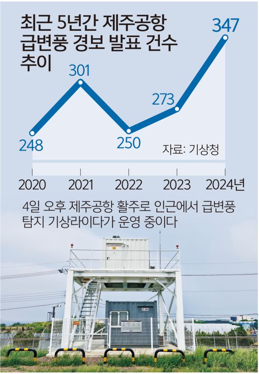 50억원 상당인 급변풍 탐지 기상라이다 2대가 제주에 도입된 건 우리나라 공항 중에서도 특히 급변풍이 심한 공항이라서다. 지난해 우리나라 전체 공항 7곳에 발표된 급변풍 경보(667회) 중 무려 52%(347회)가 제주에 내려진 경보였다. 기상청 관계자는 “여름철 남풍이 불기 시작하면 한라산 때문에 갈라진 바람이 제주공항에서 수렴하는 현상을 보이면서 급변풍 현상이 심화한다”고 했다.