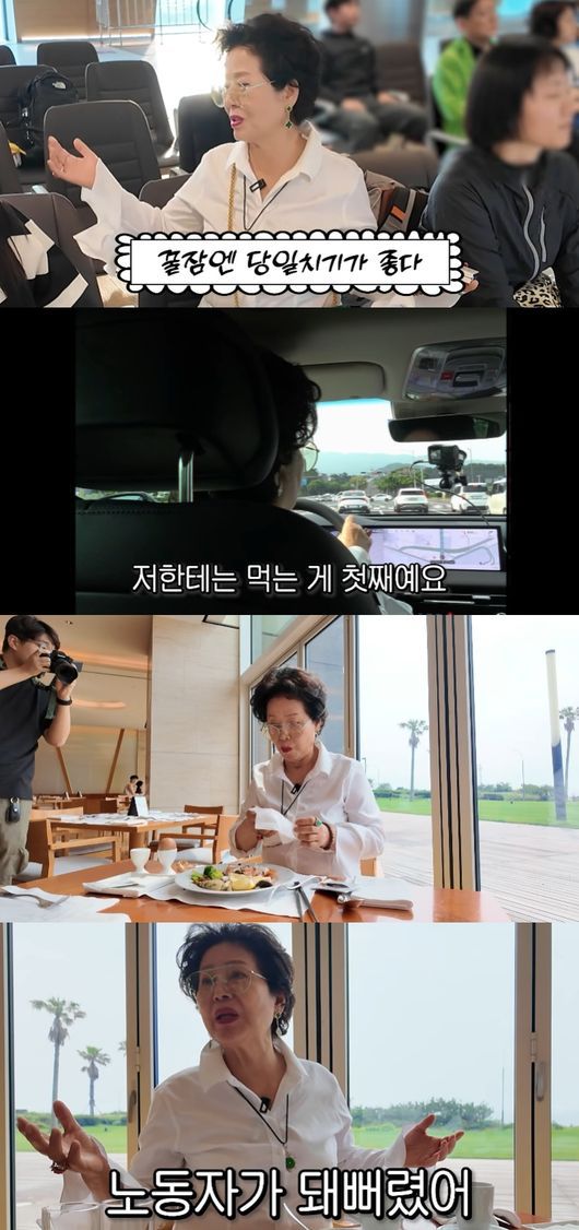 이윽고 제주도에 도착한 선우용녀는 오전 8시 30분 렌트카를 빌리자마자 호텔 조식을 먹기 위해 이동했다. 그는 “왔으니 조식 먹어야 하지 않냐. 나한테 먹는 게 첫째다”라고 말했다.
