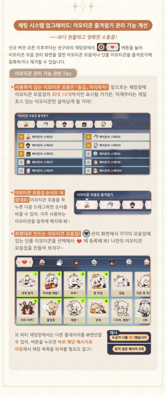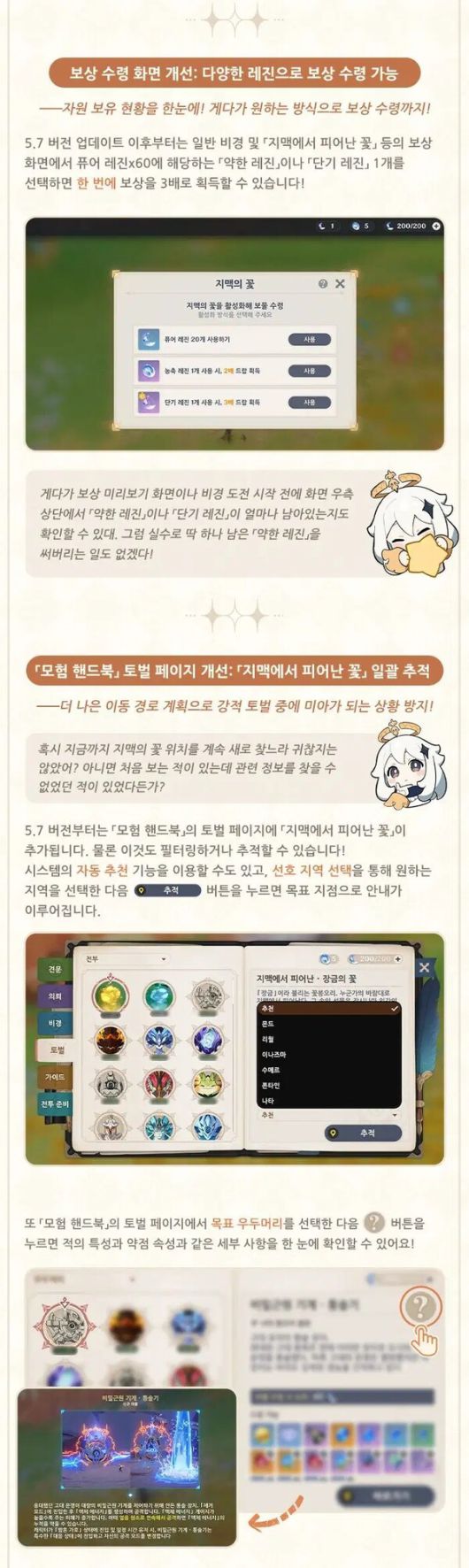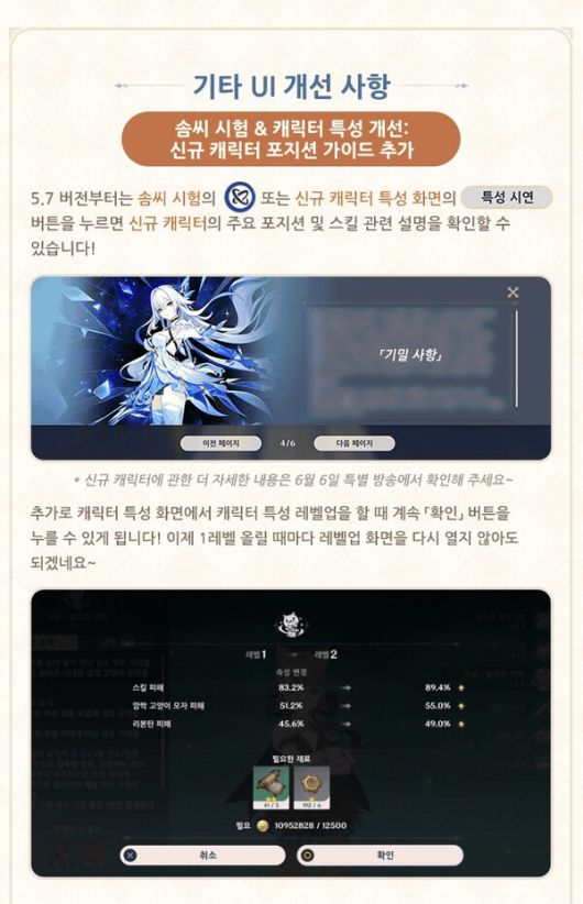 이외에도 솜씨 시험 & 캐릭터 특성, 보상 수령 화면, 모험 핸드북 토벌 페이지, 채팅 시스템 이모티콘 즐겨찾기 관리 기능이 개선된다. 또한 임무 리소스 관리 기능이 업데이트된다.