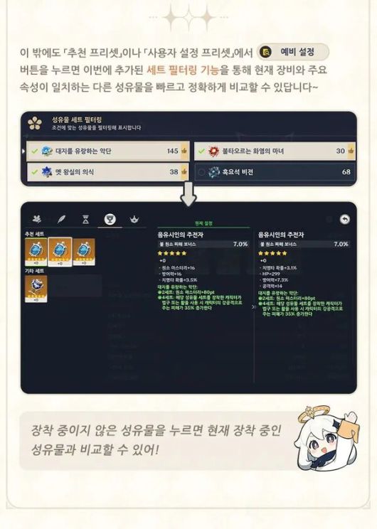 호요버스는 "이외 추천 프리셋이나 사용자 설정 프리셋에서 예비 설정 버튼을 누르면 이번에 추가된 세트 필터링 기능으로 현재 장비와 주요 속성이 일치하는 다른 성유물을 빠르고 정확하게 비교할 수 있다"고 첨언했다.