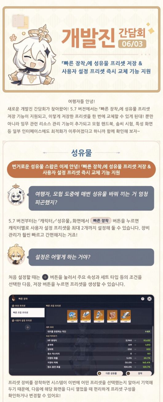 호요버스는 오는 6일 원신 5.7 버전 프리뷰 방송 진행 전 개발진 간담회로 새로운 편의 기능 소식을 전했다. 호요버스는 "5.7 버전에서는 빠른 장착에 성유물 프리셋 저장 기능이 지원되고 저장한 프리셋을 한 번에 교체할 수 있다. 뿐만 아니라 임무 관련 리소스 관리 기능이 추가되고 모험 핸드북, 솜씨 시험, 특성 화면 등 일부 인터페이스에도 최적화가 이뤄질 예정이다"며 말문을 열었다.