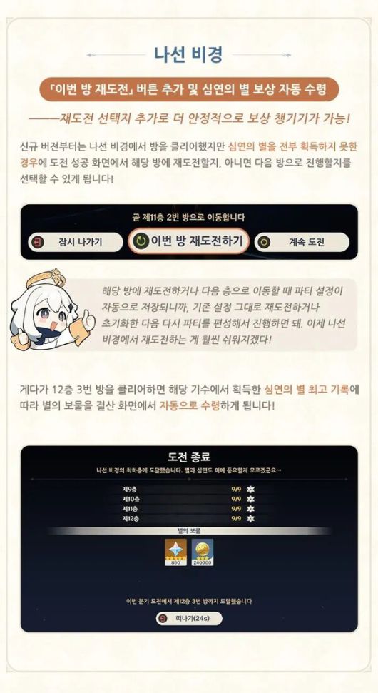나선 비경에는 '이번 방 재도전' 버튼과 심연의 별 보상 자동 수령 기능이 추가된다. 나선 비경에서 방을 클리어했지만 심연의 별을 전부 획득하지 못한 경우에 도전 성공 화면에서 해당 방에 재도전할지, 아니면 다음 방으로 진행할 지 선택할 수 있는 기능이다.