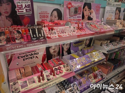 명동 다이소에 뷰티 코너. 클리오와 토니모니, 더 샘 등 친숙한 브랜드 제품이 진열돼 있다. [사진=박은경 기자] |
