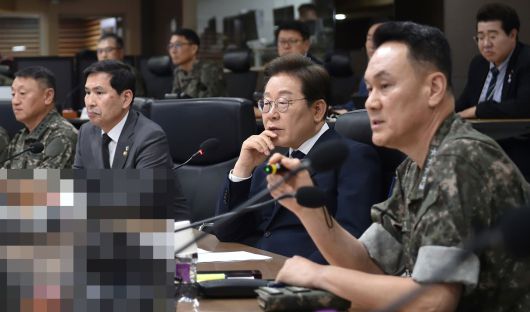 이재명 대통령이 4일 서울 용산 합동참모본부 전투통제실에서 김명수(오른쪽) 합참의장 등 군 지휘부의 군사 대비 태세 보고를 받고 있다. /국방부 |