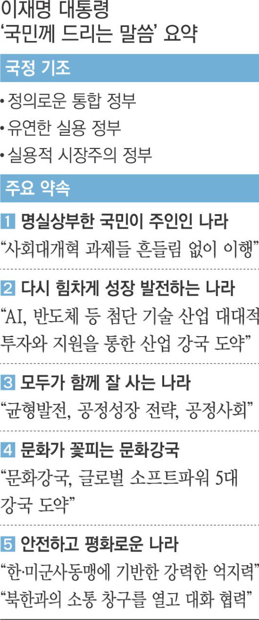 이 대통령은 이날 5가지 국정과제로 국민이 주인인 나라, 다시 힘차게 성장 발전하는 나라, 모두 함께 잘사는 나라, 문화가 꽃피는 나라, 안전하고 평화로운 나라를 제시했다.