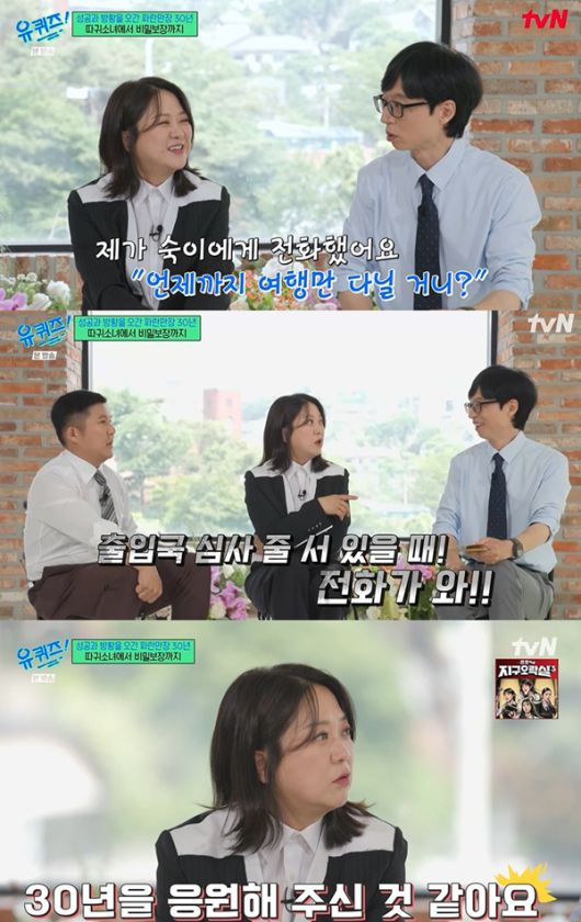 이에 김숙은 "선배가 신기가 있다. 출입국 심사 줄 서 있을 때 전화가 온다. 너무 무섭다. 운전하며 낚시를 가고 있는데 전화가 온다 '어디 가냐 '하면 깜짝 놀란다"며 "송은이, 유재석 모두 분기별로 연락이 와서 '같이 해볼래?"라고 한다. 응원을 30년 동안 해주셨다. 나의 서포터즈가 너무 쟁쟁하다"고 고마움을 드러냈다.