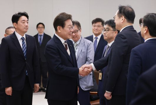 이재명 대통령이 4일 서울 용산 대통령실 청사에서 열린 \'대통령 1호 명령, 비상경제점검 태스크포스(TF) 회의\'에 참석하며 정인교 산업통상자원부 통상교섭본부장과 인사하고 있다. 연합뉴스 |