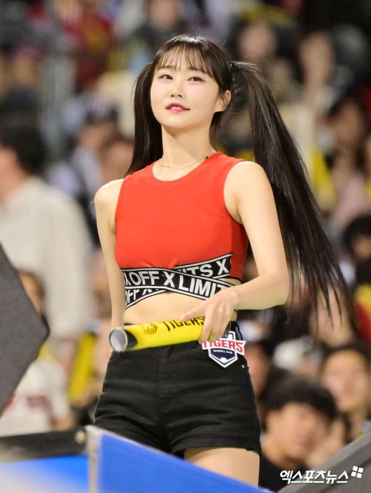 (엑스포츠뉴스 잠실, 김한준 기자) 4일 오후 서울 송파구 잠실야구장에서 열린 '2025 신한 SOL Bank KBO리그' KIA 타이거즈와 두산 베어스의 경기, KIA정가예 치어리더가 열띤 응원을 선보이고 있다.김한준 기자 kowel@xportsnews.com