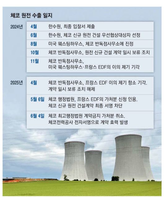 지난달 7일 계약이 불발된 이후 답보 상태에 놓였던 이번 계약은 이날 체코 최고행정법원이 한수원 손을 들어주며 실마리를 찾았다. 법원은 프랑스전력공사(EDF)가 요청한 한수원과 EDUⅡ 간 원전계약 체결 금지 가처분에 대해 취소 판결을 내렸고, 체코 정부 측은 계약서에 서명하며 곧바로 효력을 발생시켰다.